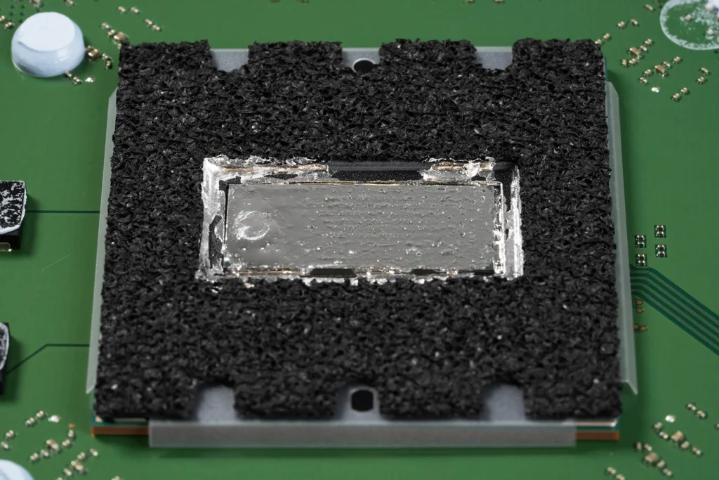 The reason Sony chose liquid metal for the PS5 Pro, as with the base PS5, is the APU’s heat density. Modern console SoCs concentrate an enormous amount of thermal output into a very small die area. Conventional paste can move heat away from the die surface adequately at moderate power levels, but at the thermal loads a next-gen console APU generates under sustained workloads, the interface material itself becomes a meaningful bottleneck. Liquid metal eliminates that bottleneck almost entirely.